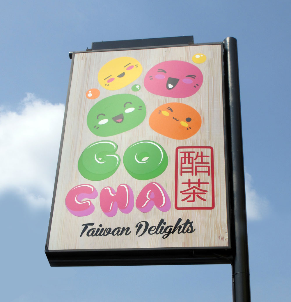 Branding for Go Cha Taiwan Delights, a new restaurant that serves contemporary Taiwanese dishes and bubble tea. The logo combines adorable characters with diverse colors, playful letters, and Chinese alphabets to attract customers’ attention. The target market is consumers of all ages who love eating and hanging out as regular customers.
